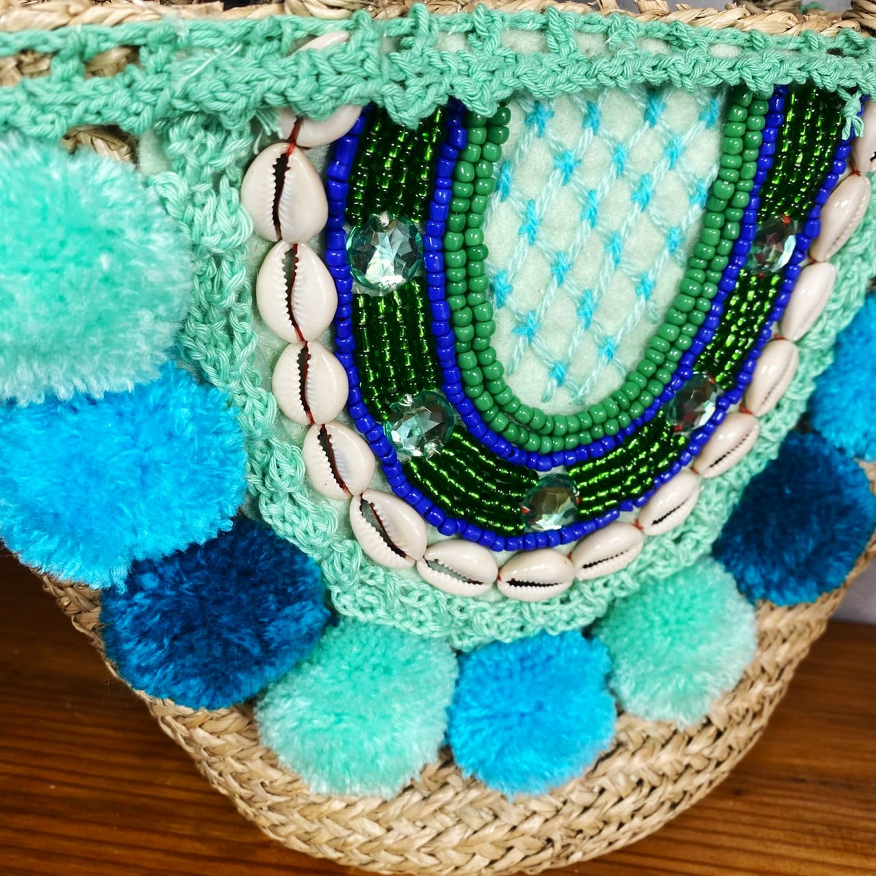 ブルーのポンポンがキュートなかごバックです。夏のお出かけやピクニックにぴったりのアイテムで、女性らしさを引き立てるデザインとなっています。軽量なのに、十分な収納力を持ち、デイリーユースにも対応します。