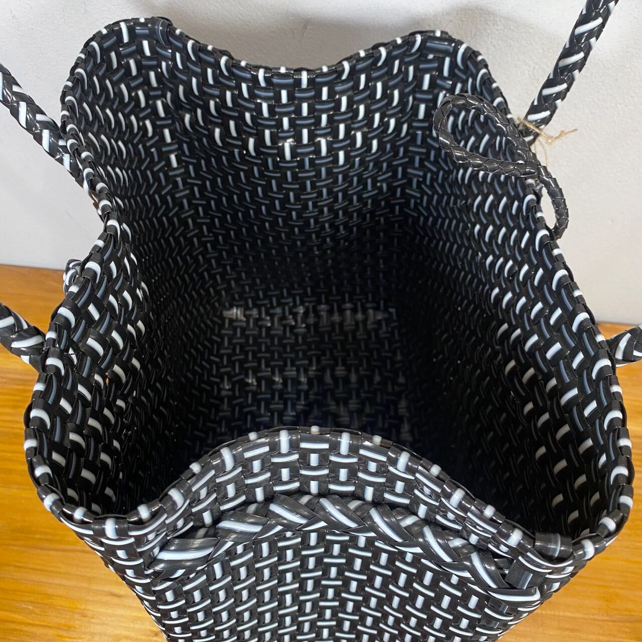 シンプルなブラック&ホワイトが目を引くプラスチックバックです。デイリーユースはもちろん、アウトドアやイベントにも活躍するアイテムとして、おしゃれなコーディネートを演出します。軽量設計で持ち運びも簡単、しっかりとした作りで安心してご使用いただけます。