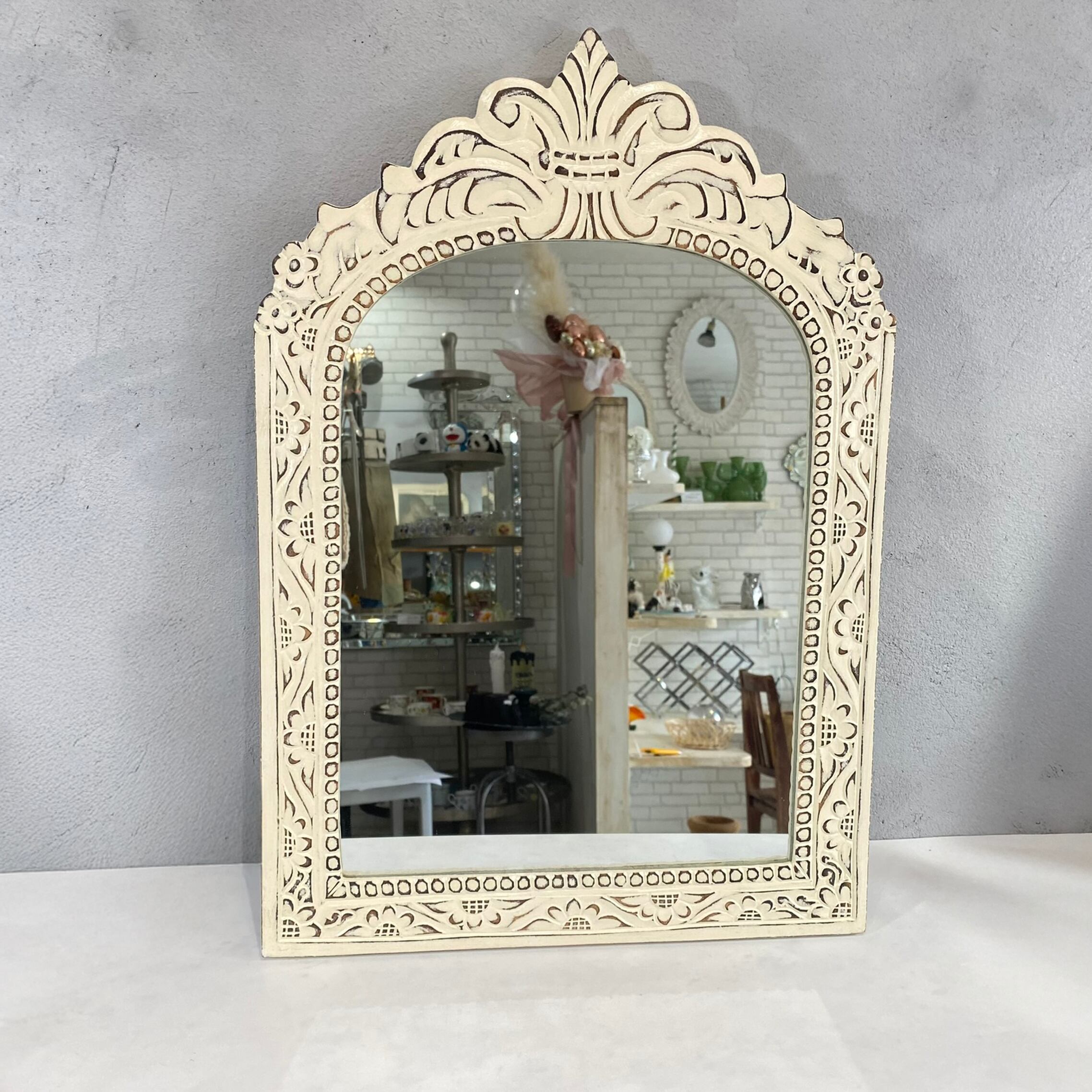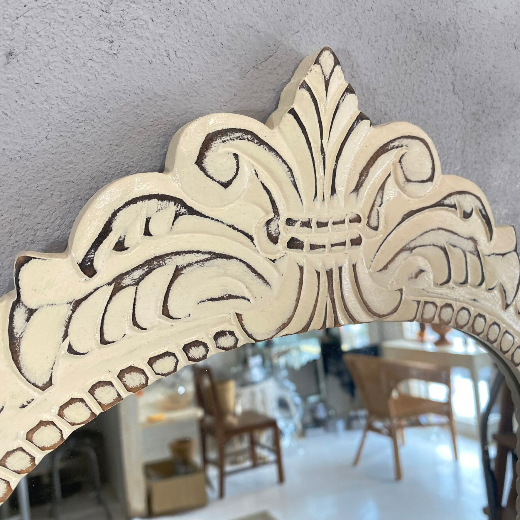 手彫り装飾が施されたアイボリーのフレンチミラー。このミラーは、手作りならではの温かみと繊細なデザインが特徴で、空間に優雅さをプラスします。お部屋のどこに置いても、個性的でおしゃれなアクセントとなり、鏡としての機能だけでなく、インテリアとしても楽しめます。
