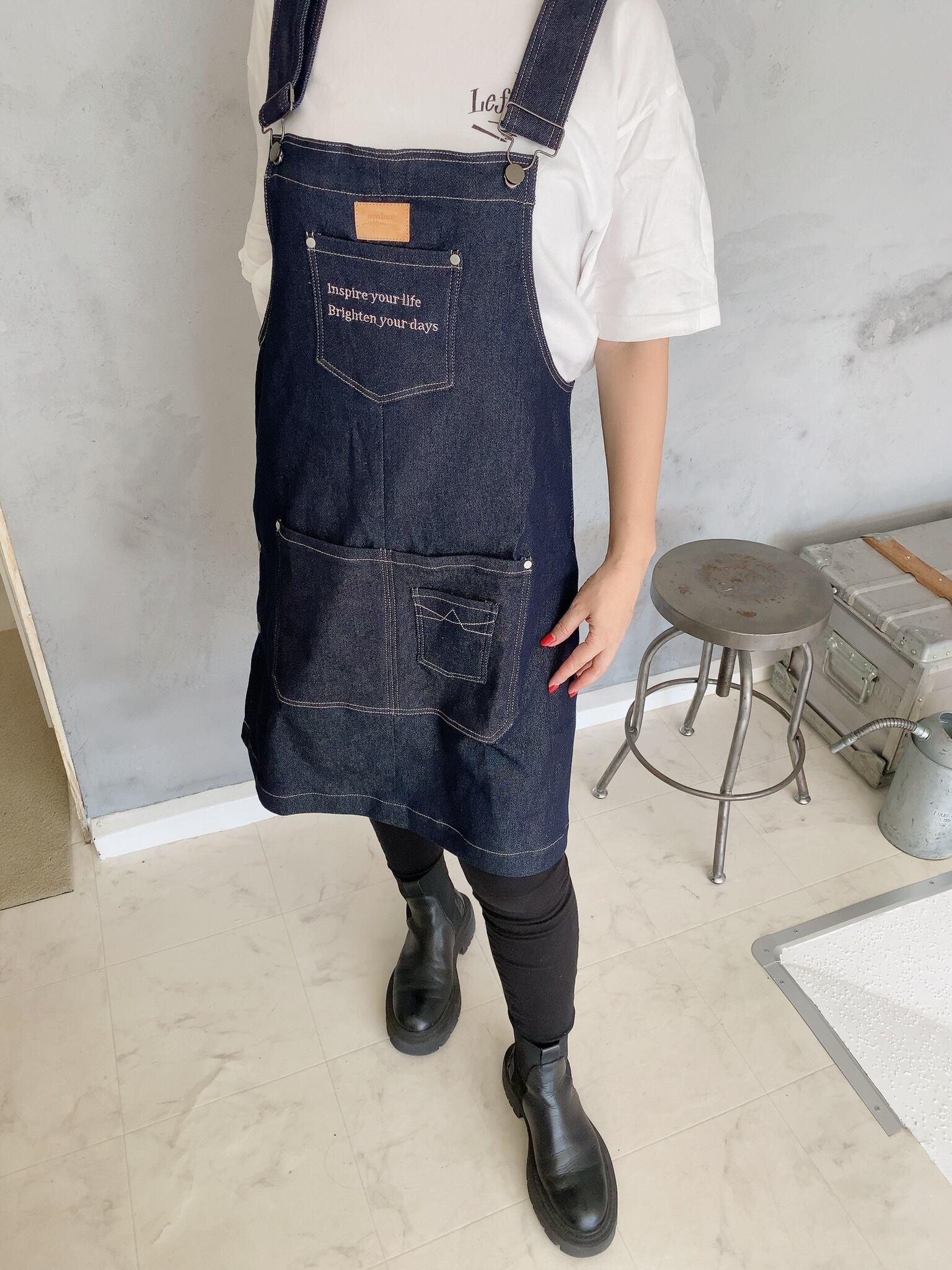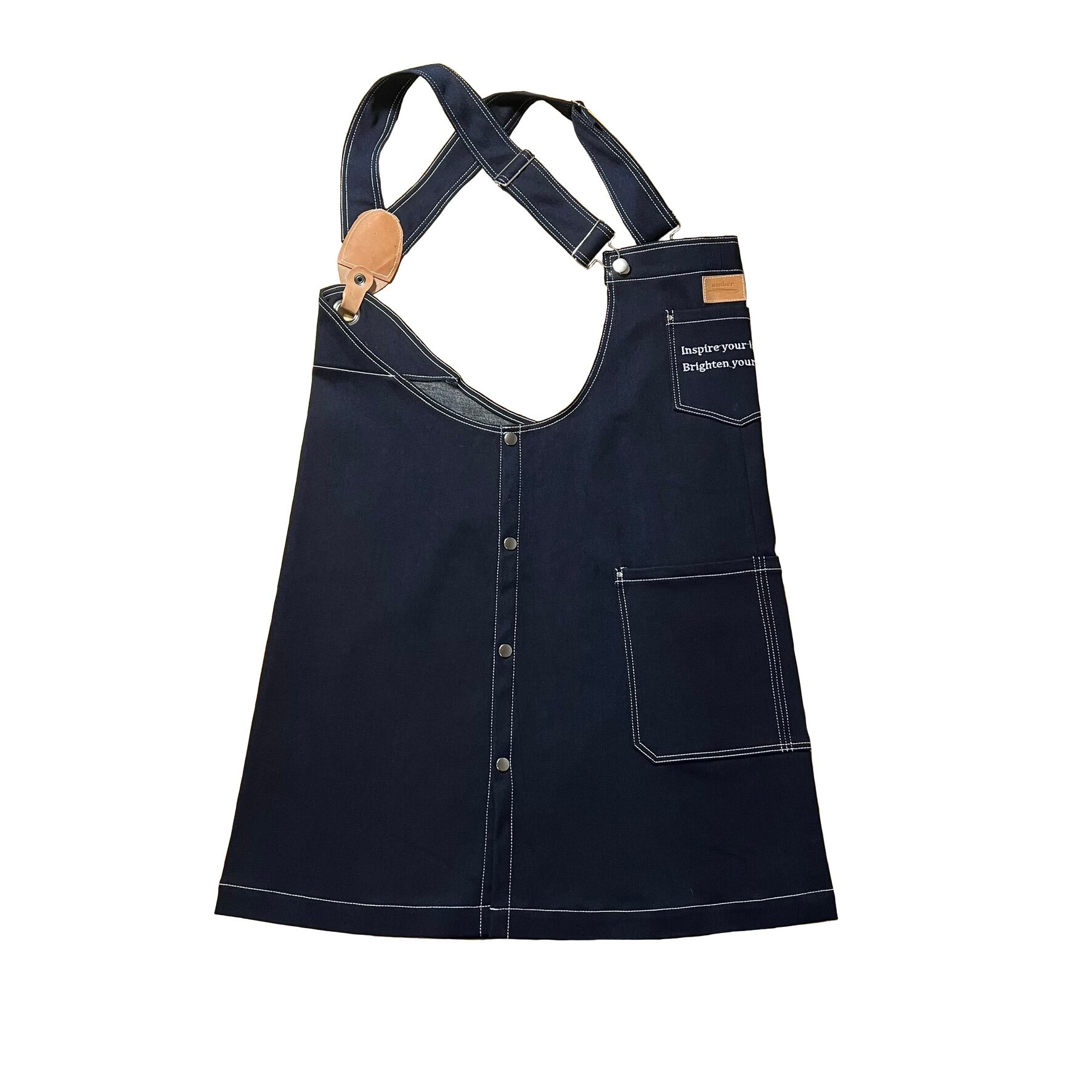 国産デニムと肩紐にレザー(本牛革)を使用した贅沢なワークエプロン。