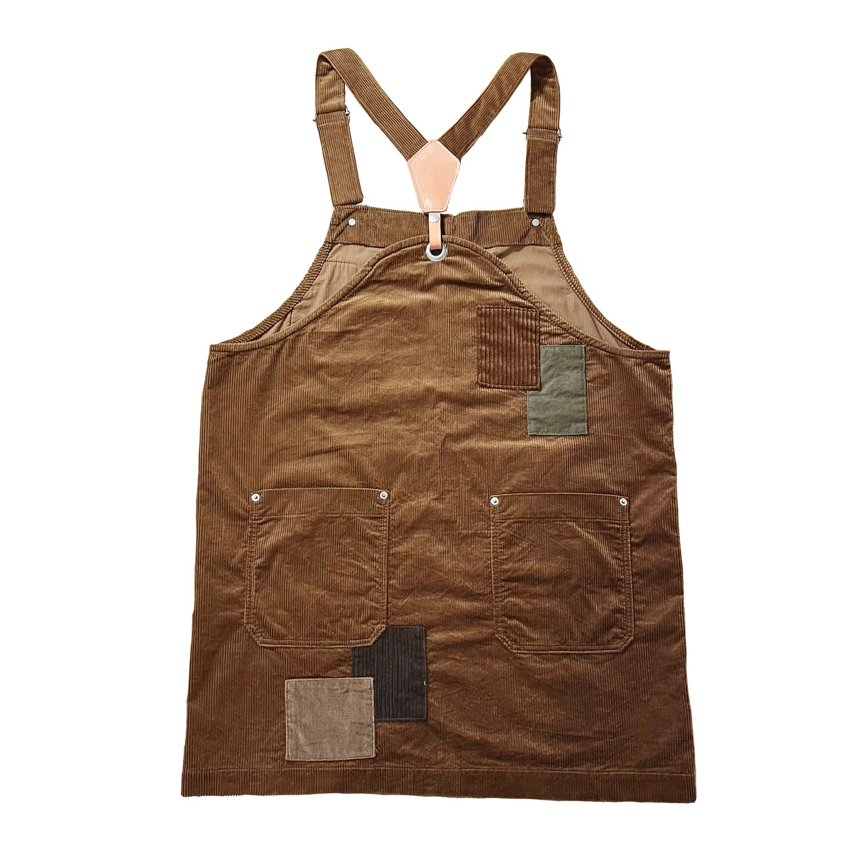 コーデュロイに異素材のパッチワーク、肩紐にはレザー(本革)を使用したコーデュロイ好きにはたまらないエプロン。